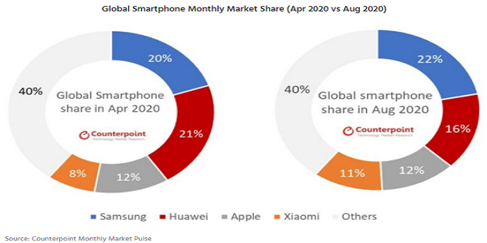 কাউন্টারপয়েন্ট রিসার্চের তথ্য অনুযায়ী, চলতি বছরের এপ্রিলে হুয়াওয়ে’র কাছে বিশ্ব বাজারের শীর্ষস্থান হারানোর পর আগস্ট নাগাদ তা পুনরায় অর্জন করেছে স্যামসাং। বাজারের মোট হিস্যার ২২ শতাংশ এই দক্ষিণ কোরিয়া ভিত্তিক প্রতিষ্ঠানটির দখলে রয়েছে বলে জানানো হয়, যা স্মার্টফোন নির্মাতা প্রতিষ্ঠানগুলোর তুলনামূলক বিচারে সর্বোচ্চ। ১৬ শতাংশ শেয়ার নিয়ে বাজারের দ্বিতীয় অবস্থানে রয়েছে হুয়াওয়ে।