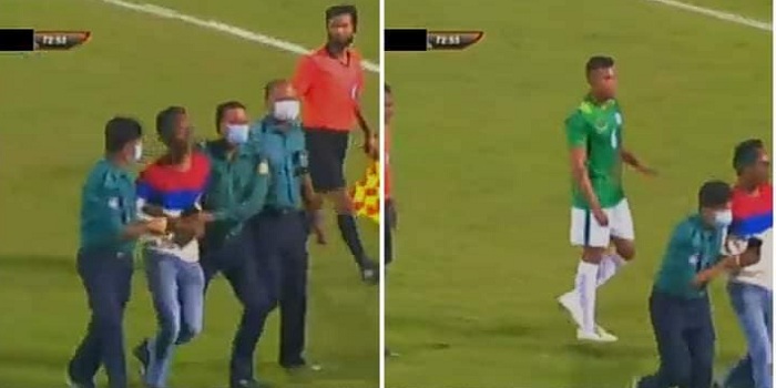 মাঠে রেফারি,সহকারী রেফারির সামনে ওই ঘটনায় হতভম্ব হয়েছে গ্যালারিতে থাকা দর্শকরা। ওই দর্শককে নিরাপত্তা কর্মীরা ঘটনাস্থল থেকে ধরে নিয়ে মিডিয়া সেন্টারের নিচে মেডিকেল রুমে নিয়ে আটকে রাখা হয়। ওই ঘটনায় খেলা কিছুক্ষনের জন্য রাখা হয় বন্ধ। ম্যাচ শেষে ওই ক্রেজি দর্শকের খোঁজ নিয়েছেন বাংলাদেশ অধিনায়ক জামাল ভূঁইয়া। তাকে দ্রুত ছেড়ে দেয়া দেয়ার আবেদন বাফুফেকে জানিয়েছেন তিনি। পরে তাকে ছেড়ে দেয়া হয়।