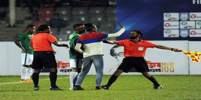 মাঠে রেফারি,সহকারী রেফারির সামনে ওই ঘটনায় হতভম্ব হয়েছে গ্যালারিতে থাকা দর্শকরা। ওই দর্শককে নিরাপত্তা কর্মীরা ঘটনাস্থল থেকে ধরে নিয়ে মিডিয়া সেন্টারের নিচে মেডিকেল রুমে নিয়ে আটকে রাখা হয়। ওই ঘটনায় খেলা কিছুক্ষনের জন্য রাখা হয় বন্ধ। ম্যাচ শেষে ওই ক্রেজি দর্শকের খোঁজ নিয়েছেন বাংলাদেশ অধিনায়ক জামাল ভূঁইয়া। তাকে দ্রুত ছেড়ে দেয়া দেয়ার আবেদন বাফুফেকে জানিয়েছেন তিনি। পরে তাকে ছেড়ে দেয়া হয়।