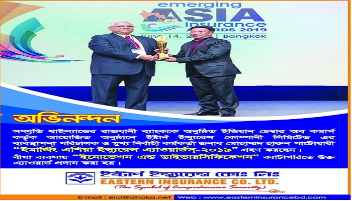 পুঁজিবাজারের তালিকাভুক্ত ইস্টার্ন ইন্স্যুরেন্স লিমিটেড ইমার্জিং এশিয়া ইন্স্যুরেন্স এ্যাওয়ার্ডস ২০১৯ পেয়েছে। সম্প্রতি থাইল্যান্ডের রাজধানী ব্যাংককে অনুষ্ঠিত এক অনুষ্ঠানে এ এ্যাওয়ার্ডস গ্রহণ করেন ব্যবস্থাপনা পরিচালক ও মুখ্য নির্বাহী কর্মকর্তা মোহাম্মদ হারুন পাটোয়ারী।