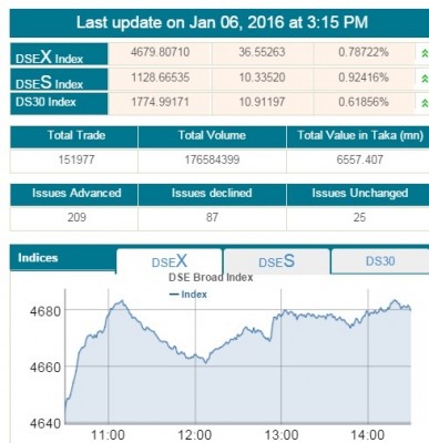ডিএসইএক্স বা প্রধান মূল্য সূচক ৩৬ পয়েন্ট বেড়ে ৪ হাজার ৬৭৯ পয়েন্টে অবস্থান করছে। ডিএসইএস বা শরীয়াহ সূচক ১০ পয়েন্ট বেড়ে অবস্থান করছে এক হাজার ১২৮ পয়েন্টে। ডিএস৩০ সূচক ১০ পয়েন্ট বেড়ে দাঁড়িয়েছে এক হাজার ৭৭৪ পয়েন্টে।
