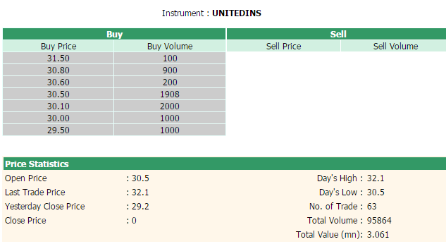ঢাকা স্টক এক্সচেঞ্জে (ডিএসই) আজ বৃহস্পতিবার লেনদেনের দুই ঘণ্টার মধ্যে বিক্রেতা উধাও গেছে পুঁজিবাজারে তালিকাভুক্ত কোম্পানি ইউনাইটেড ইন্স্যুরেন্সের শেয়ারের। এতে কোম্পানির শেয়ারটি হল্টেড হয়ে মূল্য স্পর্শ করছে সার্কিট ব্রেকারে।