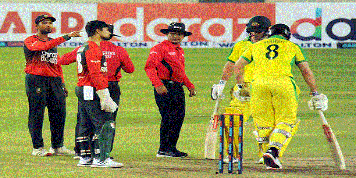 অস্ট্রেলিয়ার বিপক্ষে পাঁচ ম্যাচ টি-টোয়েন্টি সিরিজের প্রথম দুই ম্যাচে দুর্দান্ত জয় তুলে নেয় স্বাগতিক বাংলাদেশ। শুক্রবার (৬ আগস্ট) মিরপুরের শের-ই-বাংলা ক্রিকেট স্টেডিয়ামে টস জিতে ব্যাট করতে নেমে টাইগার দলপতি মাহমুদুল্লাহ রিয়াদের ফিফটিতে ৯ উইকেট হারিয়ে ১২৭ রান সংগ্রহ করে বাংলাদেশ। জয়ের জন্য অজিদের প্রয়োজন ছিল ১২৮ রান। কিন্তু নির্ধারিত ২০ ওভার শেষে ৪ উইকেট হারিয়ে ১১৭ রান করতে সক্ষম হয় অস্ট্রেলিয়া। যার ফলে ১০ রানের জয় নিয়ে মাঠ ছাড়ে বাংলাদেশ। একই সঙ্গে অস্ট্রেলিয়াকে পর পর তিন ম্যাচে হারিয়ে দুই ম্যাচ হাতে রেখেই সিরিজ নিজেদের করে নিল টাইগাররা।