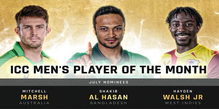 সদ্য সমাপ্ত জুলাই মাসের আইসিসির সেরা খেলোয়াড়ের মনোনয়ন পেয়েছেন বিশ্বসেরা অলরাউন্ডার সাকিব আল হাসান। মনোনয়ন পাওয়া অন্য দুই জন হলেন অস্ট্রেলিয়ার মিচেল মার্শ ও ওয়েস্ট ইন্ডিজের হেডেন ওয়ালশ জুনিয়র।
