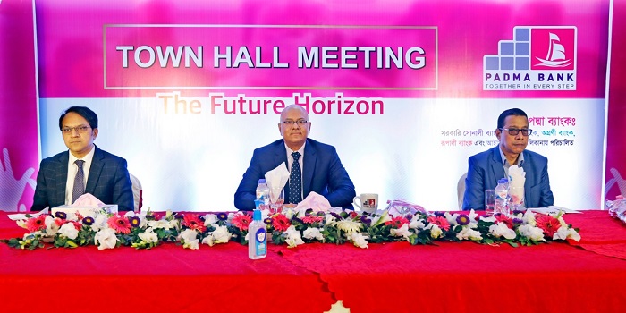 টাউন হল মিটিংয়ে, ব্যবস্থাপনা পরিচালক ও প্রধান নির্বাহী কর্মকর্তা তারেক রিয়াজ খান তার তিন বছরের অপারেশনাল, কৌশলগত ও স্ট্র্যাটেজিক কর্মপরিকল্পনা তুলে ধরেন। তিনি বলেন, পদ্মা ব্যাংকের একদল মেধাবী, তরুণ ও উজ্জীবিত লড়াকু কর্মীবাহিনীকে সঙ্গে নিয়ে আমি আমাদের সম্মানিত গ্রাহক, নিয়ন্ত্রকসংস্থা ও শেয়ারহোল্ডারদের আস্থা অর্জনের অঙ্গীকার করছি। তিনি আরো বলেন, ব্যবসার উন্নতি, ঝুঁকি নিয়ন্ত্রন এবং অপারেশনাল ও আধুনিক প্রযুক্তির মৌলিক বিষয়গুলোতে গুণগতমানের উন্নয়ন সাধনের মাধ্যমে, আগামী ৩-৫ বছরের মধ্যে অন্যতম একটি শক্তিশালী ও লাভজনক প্রতিষ্ঠান হবে পদ্মা ব্যাংক।