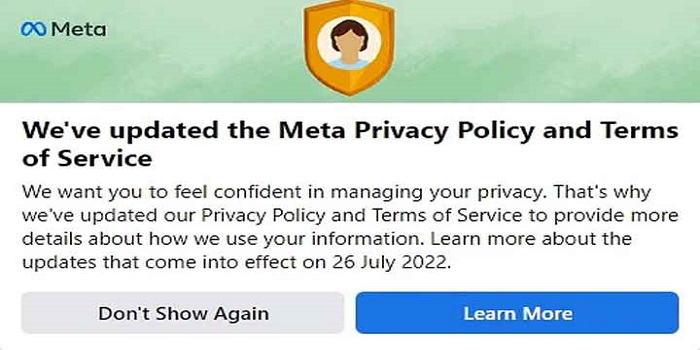 এতে বলা হচ্ছে, ফেসবুক তাদের ব্যক্তিগত গোপনীয়তা নীতিমালা হালনাগাদ করছে। এটি আগামী ২৬ জুলাই থেকে কার্যকর হবে। গতকাল থেকে মেটা এই নোটিফিকেশন পাঠানো শুরু করেছে। খবর বিবিসির।