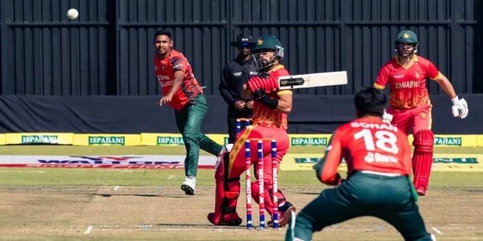 হারারে ক্রিকেট গ্রাউন্ডে টস জিতে আগে ব্যাট করার সিদ্ধান্ত নেন জিম্বাবুয়ের অধিনায়ক ক্রেইগ এরভিন। দুই ওপেনার ভাল ভাল সুচনা এনে দেন। দলীয় ২৯ রানে নাসুমের বলে ফিরে যান চাকাভা। নাসুম আহমেদের পর জিম্বাবুয়ের শিবিরে জোড়া আঘাত আনেন মেহেদি হাসান। ওয়েসলে মাধভেরেকে বোল্ড করে সাজঘরে পাঠান তিনি। এর রেশ না কাটতেই সিকান্দার রাজাকে মুস্তাফিজের ক্যাচে পরিণত করেন তিনি। পরে মোসাদ্দেকের বলে প্যাভিলিয়নে ফেরেন শন উইলিয়ামস। মোসাদ্দেকের পর বোলিংয়ে এসে উইকেটের দেখা পান মাহমুদউল্লাহ রিয়াদ। ৬৭ রানে ৬ উইকেট হারিয়ে চাপে পড়ে যায় স্বাগতিকরা। সেখান থেকে নাসুমের এক ওভারে ৩৪ রান নেন রায়ান বার্লে। এর পর ম্যাচে ঘুরে যায় জিম্বাবুয়ের দিকে। শেষ পর্যন্ত ৮ উইকেট হারিয়ে ১৫৬ রান সংগ্রহ করেছে জিম্বাবুয়ে।