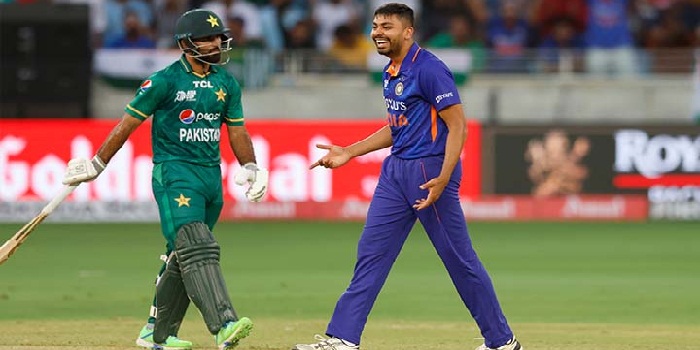রোববার দুবাই স্টেডিয়ামে টস জিতে পাকিস্তানকে প্রথমে ব্যাটিংয়ে পাঠায় ভারত। আগে ব্যাট করতে নেমে তৃতীয় ওভারেই উইকেট হারান পাকিস্তানের অধিনায়ক বাবর আজম। ২.৩ ওভারে দলীয় ১৫ রানে ফেরেন তিনি।