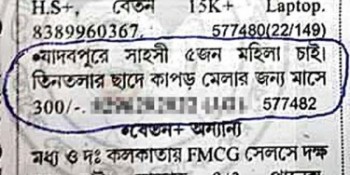 “যাদবপুরে সাহসী পাঁচজন মহিলা চাই। তিন তলার ছাদে কাপড় মেলার জন্য।” শ্রেণিবদ্ধ বিজ্ঞাপনের কলামে এই অদ্ভুত আবেদন দেখেই অনেকেই কৌতূহল সংবরণ করতে পারেনি। তড়িঘড়ি তার ছবি তুলে ছড়িয়ে দিয়েছে হোয়াটসঅ্যাপ, ফেসবুকে। আর ছবিটা ভাইরাল হতে বেশি সময় লাগেনি।
