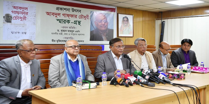 মঙ্গলবার (১৭ জানুয়ারি) সচিবালয়ে তথ্য অধিদফতর সম্মেলন কক্ষে মোনায়েম সরকার সম্পাদিত ‘আবদুল গাফফার চৌধুরী স্মারক গ্রন্থে’র মোড়ক উন্মোচন অনুষ্ঠানে প্রধান অতিথির বক্তৃতা শেষে সাংবাদিকদের প্রশ্নের জবাবে মন্ত্রী একথা বলেন। শতাধিক গ্রন্থপ্রণেতা বিশিষ্ট রাজনীতিক ও বাংলাদেশ ফাউন্ডেশন ফর ডিভালপমেন্ট রিসার্চের মহাপরিচালক মোনায়েম সরকারের সভাপতিত্বে যুক্তরাজ্য আওয়ামী লীগ সভাপতি বীর মুক্তিযোদ্ধা সুলতান শরীফ, প্রধান তথ্য অফিসার মো. শাহেনুর মিয়া, বাংলা টিভির চেয়ারম্যান আব্দুস সামাদ, আগামী প্রকাশনীর স্বত্ত্বাধিকারী ওসমান গণি, গ্রন্থটির সহ-সম্পাদক ড. দিনাক সোহানী ও অপূর্ব শর্মা বিশেষ অতিথি হিসেবে অনুষ্ঠানে যোগ দেন।