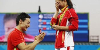 রিও অলিম্পিকে নারীদের তিন মিটার স্প্রিংবোর্ডে সদ্য সিলভার পদক জিতেছেন হি জি। আর খানিকক্ষণ পরেই তিনি এমন এক পরিস্থিতির মুখোমুখি হলেন, যেটার জন্য এই চীনা ডাইভার মোটেও প্রস্তুত ছিলেন না। কি আর, তার সামনে ডায়মণ্ডের আংটি ও গোলাপ ফুল হাতে হাঁটু গাঁড়ার ভঙ্গিতে পেলেন প্রেমিক কিন কাই। যিনি গত সপ্তাহে তার ইভেন্টে জিতেছেন ব্রোঞ্জ।