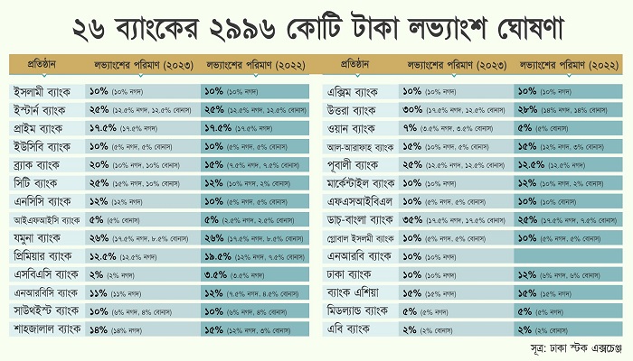 তথ্য অনুযায়ী, দেশের ব্যাংকগুলোর মধ্যে পুঁজিবাজারে তালিকাভুক্ত রয়েছে এমন ব্যাংকের সংখ্যা ৩৬টি। এরমধ্যে এ পর্যন্ত ২৮টি ব্যাংকের বার্ষিক লভ্যাংশ দেয়ার তথ্য পাওয়া গেছে। এরমধ্যে ২৬টি ব্যাংক নগদ লভ্যাংশ দিচ্ছে। আর ২টি ব্যাংক শুধু বোনাস লভ্যাংশ দেয়ার সিদ্ধান্ত নিয়েছে। সেগুলো হচ্ছে- ইসলামী, ইষ্টার্ন, প্রাইম, ইউসিবি, ব্র্যাক, সিটি, এনসিসি, আইএফআইসি, যমুনা, প্রিমিয়ার, এসবিএসি, এনআরবিসি, সাউথইস্ট, শাহজালাল, এক্সিম, উত্তরা, ওয়ান, আল-আরাফাহ, পূবালী, মার্কেন্টাইল, ফার্স্ট সিকিউরিটি, ডাচ্-বাংলা, গ্লোবাল ইসলামী, এনআরবি, ঢাকা ব্যাংক, ব্যাংক এশিয়া, মিডল্যান্ড এবং এবি ব্যাংক পিএলসি।