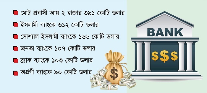 বিদায়ী অর্থবছরে আল আরাফাহ ইসলামী ব্যাংকের মাধ্যমে প্রবাসী আয় এসেছে ৮৪ কোটি ডলার, ন্যাশনাল ব্যাংকের মাধ্যমে ৯০ কোটি ডলার, মিউচ্যুয়াল ট্রাস্ট ব্যাংকের মাধ্যমে ৭১ কোটি ডলার, এনিসিসি ব্যাংকের মাধ্যমে ৭১ কোটি ডলার, ট্রাস্ট ব্যাংকের মাধ্যমে ৮৯ কোটি ডলার, পুবালী ব্যাংকের মাধ্যমে ৬৫ কোটি ডলার, যমুনা ব্যাংকের মাধ্যমে ৫৬ কোটি ডলার ও সিটি ব্যাংকের মাধ্যমে ৫৭ কোটি ডলার প্রাসী আয় দেশে এসেছে।