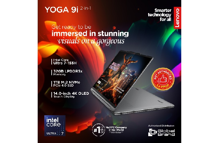 গ্লোবাল ব্র্যান্ড প্রাইভেট লিমিটেড পরিবেশিত লেনোভো বাংলাদেশের বাজারে প্রথম নিয়ে এসেছে ইন্টেল কোর আলট্রা সেভেন প্রসেসর বিশিষ্ট হাই পারফরম্যান্স ইয়োগা নাইন আই টু ইন ওয়ান টাচস্ক্রীন ল্যাপটপ। লো ব্লু লাইট ১৪ ইঞ্চি 4K ওলেড ডিসপ্লে বিশিষ্ট এই ল্যাপটপটিতে ব্যবহৃত হয়েছে সর্বোচ্চ ৪.৮ গিগাহার্জ বিশিষ্ট ইন্টেল কোর আল্ট্রা সেভেন-১৫৫ এইচ প্রসেসর, AI Boost NPU , ইন্টিগ্রেটেড ইন্টেল আর্ক গ্রাফিক্স,১টিবি এনভিএমই এসএসডি এবং ৩২ জিবি এলপি ডিডআরফাইভ র্যাম ।