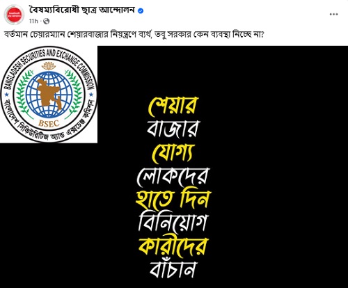 এমন অবস্থায় বিএসইসির ব্যর্থ চেয়ারম্যানের বিরুদ্ধে কেন ব্যবস্থা নিচ্ছে না সরকার এমন প্রশ্ন রেখেছে বৈষম্য বিরোধী ছাত্র আন্দোলন। গণ অভ্যুত্থানে নেতৃত্ব দেওয়া এই সংগঠনটির পক্ষ থেকে বল হয়, বর্তমান চেয়ারম্যান শেয়ারবাজার নিয়ন্ত্রণে ব্যর্থ, তবু সরকার কেন ব্যবস্থা নিচ্ছে না? সংগঠনটির ভেরিফায়েড ফেইসবুক পেইজে এমন পোস্ট দিয়ে প্রশ্ন রেখেছে সরকারের নিকট।