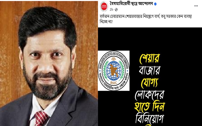 এমন অবস্থায় বিএসইসির ব্যর্থ চেয়ারম্যানের বিরুদ্ধে কেন ব্যবস্থা নিচ্ছে না সরকার এমন প্রশ্ন রেখেছে বৈষম্য বিরোধী ছাত্র আন্দোলন। গণ অভ্যুত্থানে নেতৃত্ব দেওয়া এই সংগঠনটির পক্ষ থেকে বল হয়, বর্তমান চেয়ারম্যান শেয়ারবাজার নিয়ন্ত্রণে ব্যর্থ, তবু সরকার কেন ব্যবস্থা নিচ্ছে না? সংগঠনটির ভেরিফায়েড ফেইসবুক পেইজে এমন পোস্ট দিয়ে প্রশ্ন রেখেছে সরকারের নিকট।