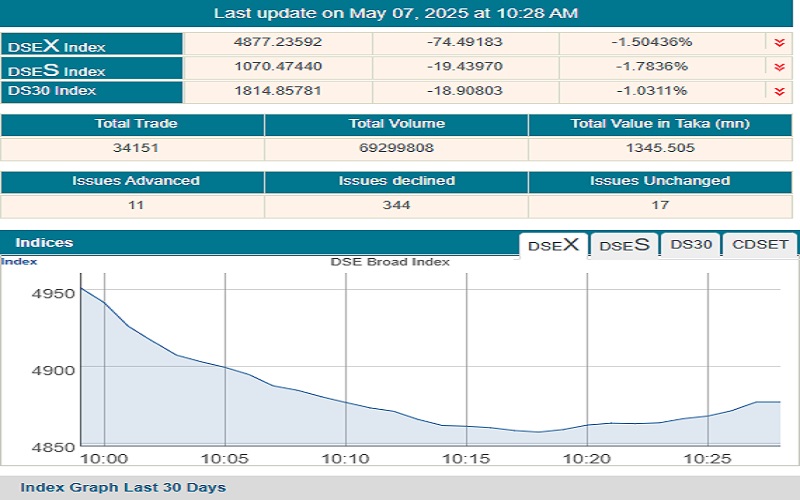 ডিএসই সূত্র মতে, দিনের শুরুতে ইতিবাচক অবস্থায় শুরু হয়েছিলো পুঁজিবাজার। তবে এটি বেশিক্ষণ স্থায়ী হয়নি। এক সময় সূচক কমে প্রায় ৯৩ পয়েন্ট।