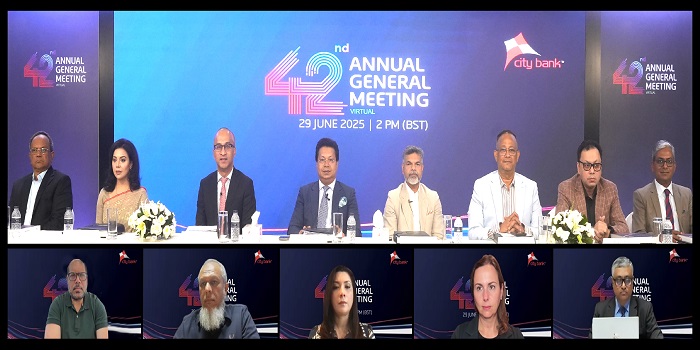 সিটি ব্যাংকের ৪২তম বার্ষিক সাধারণ সভা অনুষ্ঠিত হয়েছে। রোববার (২৯ জুন) ভার্চুয়াল প্ল্যাটফর্মের মাধ্যমে অনুষ্ঠিত এ সভায় সভাপতিত্ব করেন ব্যাংকের চেয়ারম্যান আজিজ আল কায়সার। ব্যাংকের ভাইস চেয়ারম্যান হোসেন খালেদ, পরিচালকবৃন্দ রুবেল আজিজ, হোসেন মেহমুদ, সৈয়দা শায়রীন আজিজ, সাভেরা এইচ মাহমুদ, রেবেকা ব্রোসন্যান, স্বতন্ত্র পরিচালক মতিউল ইসলাম নওশাদ, ব্যবস্থাপনা পরিচালক ও সিইও মাসরুর আরেফিন, কোম্পানি সেক্রেটারি মো. কাফি খান, পদস্থ কর্মকর্তাগণ ও বিপুল সংখ্যক শেয়ারহোল্ডার এই এজিএম-এ অংশগ্রহণ করেন।