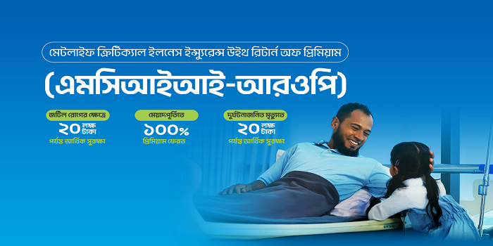 স্ট্রোক, ক্যানসার, কিডনি ফেইলিউর ও হার্ট অ্যাটাকের মত ১০ ধরনের জটিল শারীরিক অসুস্থতায় আর্থিক সুরক্ষা দিতে নতুন একটি স্বাস্থ্য বীমা চালু করেছে মেটলাইফ বাংলাদেশ। ‘মেটলাইফ ক্রিটিক্যাল ইলনেস ইন্স্যুরেন্স উইথ রিটার্ন অব প্রিমিয়াম (এমসিআইআই – আরওপি)’ নামের এ প্ল্যান বীমা গ্রহীতা ও তার পরিবারের সদস্যদের সঙ্কটকালীন পরিস্থিতিতে আর্থিক সুরক্ষা নিশ্চিতে ভূমিকা রাখবে।