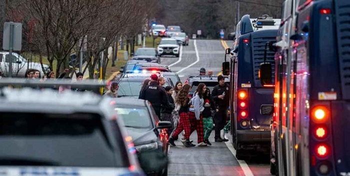 হামলার পর উদ্বিগ্ন অভিভাবকরা পুলিশের হলুদ টেপের নিচ দিয়ে মাথা নিচু করে স্কুলের ভেতরে ঢুকছেন এবং শিক্ষার্থীদের বের করে আনছেন।