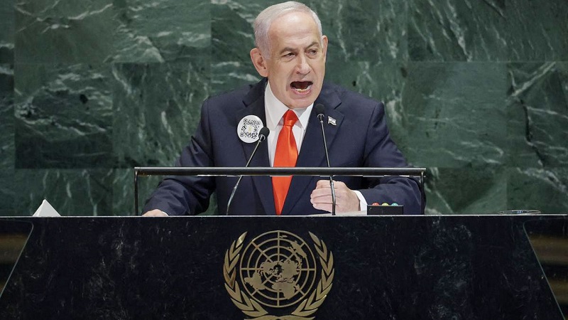 অবশ্য তিনি ভাষণ দিতে ওঠার পর সাধারণ পরিষদ মিলনায়তনে উপস্থিত রাষ্ট্রদূত ও কূটনৈতিক মিশনের প্রতিনিধিদের অধিকাংশই মিলনায়তন থেকে বেরিয়ে গিয়েছিলেন। ফাঁকা মিলনায়তনে উত্তেজিত কণ্ঠে নেতানিয়াহু বলেন, “ফিলিস্তিন রাষ্ট্রকে স্বীকৃতি প্রদানের মাধ্যমে আপনারা আসলে ইহুদি হত্যাকে সমর্থন করেছেন। একটি সন্ত্রাসী রাষ্ট্র আমাদের গলায় ছুরি ধরে থাকবে— তা আমরা কখনও মেনে নেবো না।”