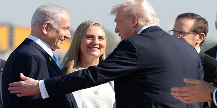 ট্রাম্প এয়ার ফোর্স ওয়ান দীর্ঘ ফ্লাইটে ভ্রমণ করে ইসরায়েলে পৌঁছান। ইসরায়েলের বেন গুরিয়ন আন্তর্জাতিক বিমানবন্দরে ডোনাল্ড ট্রাম্পকে স্বাগত জানান ইসরায়েলি প্রধানমন্ত্রী বেনিয়ামিন নেতানিয়াহু।