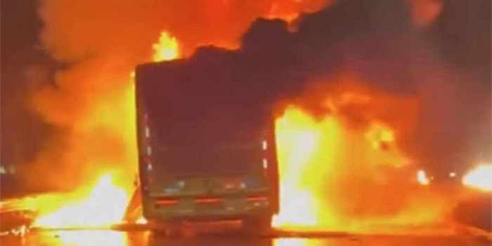পুলিশের তথ্যমতে, বেসরকারি মালিকানাধীন বাসটি ৪৪ নম্বর জাতীয় মহাসড়ক ধরে দ্রুতগতিতে যাচ্ছিল। সংঘর্ষের পর বাইকটি বাসের সামনের অংশে আটকে যায়। এরপর অল্প কিছু দূর যাওয়ার মধ্যেই বাসে আগুন ধরে যায়। দুর্ঘটনার সময় বাসের বেশির ভাগ যাত্রী ঘুমিয়ে ছিলেন। আগুন লাগার পর অনেকে জানালা ভেঙে বেরিয়ে প্রাণ বাঁচান, তবে অনেকেই বের হতে পারেননি।
