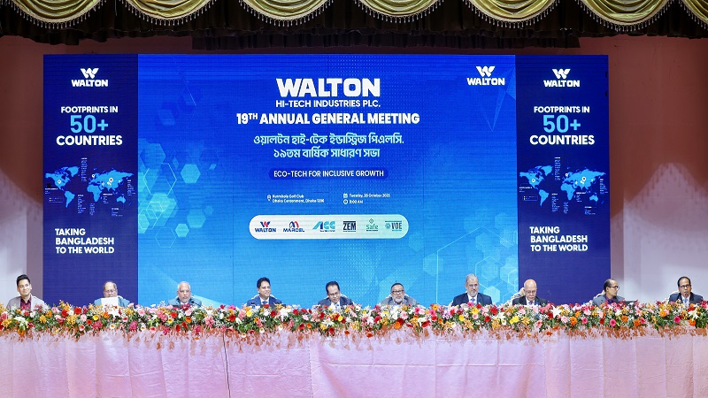 পুঁজিবাজারে তালিকাভুক্ত প্রকৌশল খাতের কোম্পানী, সুপারব্র্যান্ড ও টেক জায়ান্ট ওয়ালটন হাই-টেক ইন্ডাস্ট্রিজ পিএলসি'র ১৯তম বার্ষিক সাধারণ সভা (এজিএম) অত্যন্ত সফলভাবে অনুষ্ঠিত হলো। দেশের রাজনৈতিক অস্থিরতা ও বাণিজ্যিক প্রতিকূলতার মধ্যেও ১৭৫ শতাংশ ক্যাশ ডিভিডেন্ড দেয়ায় সভায় সন্তুষ্টি প্রকাশ করে ওয়ালটনের পরিচালনা পর্ষদকে ধন্যবাদ জানান সাধারণ বিনিয়োগকারীরা। তাঁরা দেশে উদ্ভাবনী ও সর্বাধুনিক প্রযুক্তির লিথিয়াম আয়ন ব্যাটারি উৎপাদন কারখানা স্থাপনে ওয়ালটনের বিনিয়োগের ঘোষণায় উচ্ছ্বাস প্রকাশ করেন। অচিরেই ১’শরও বেশি দেশে ওয়ালটনের বৈশ্বিক বাজার সম্প্রসারিত হবে বলে আশাবাদ ব্যক্ত করেন বিনিয়োগকারীরা।