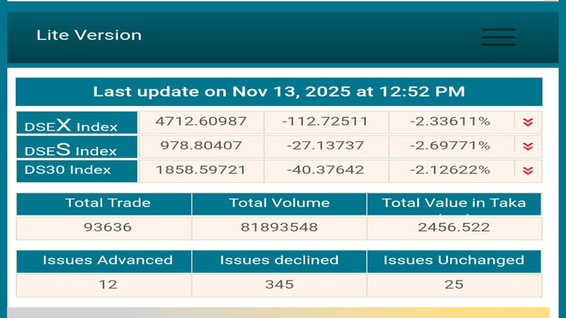 জানা গেছে, দুপুর ১ টায় ডিএসই ব্রড ইনডেক্স আগের দিনের চেয়ে ১২২ পয়েন্ট কমে অবস্থান করছে ৪ হাজার ৭০২ পয়েন্টে। আর ডিএসই শরিয়াহ সূচক ২৯ পয়েন্ট কমে অবস্থান করছে ৯৭৬ পয়েন্টে এবং ডিএসই–৩০ সূচক ৪৫ পয়েন্ট কমে অবস্থান করছে ১ হাজার ৮৫৩ পয়েন্টে।