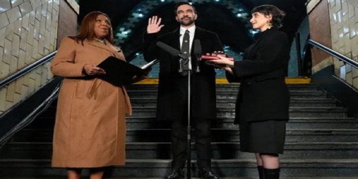 যুক্তরাষ্ট্রের বৃহত্তম মহানগরীর প্রথম মুসলিম এবং দক্ষিণ এশীয় মেয়র মামদানি তার দাদার কুরআন শরীফ হাতে টাইমস স্কয়ারের নিচে একটি অব্যবহৃত সাবওয়ে স্টেশনে শপথ গ্রহণ করেন।