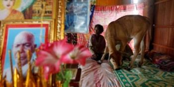 বাছুরকে স্বামী হিসেবে গ্রহণ করে বিশ্ব গণমাধ্যমে সংবাদের শিরোনাম হয়েছেন কম্বোডিয়ার নাগরিক খিম হ্যাং। ৭৪ বছর বয়সী এই নারীর স্বামী বেঁচে নেই। সম্প্রতি তিনি একটি বাছুরকে স্বামী হিসেবে গ্রহণ করেছেন। তার বিশ্বাস তার স্বামীই এই বাছুরের রূপে পূণজন্ম নিয়েছেন।