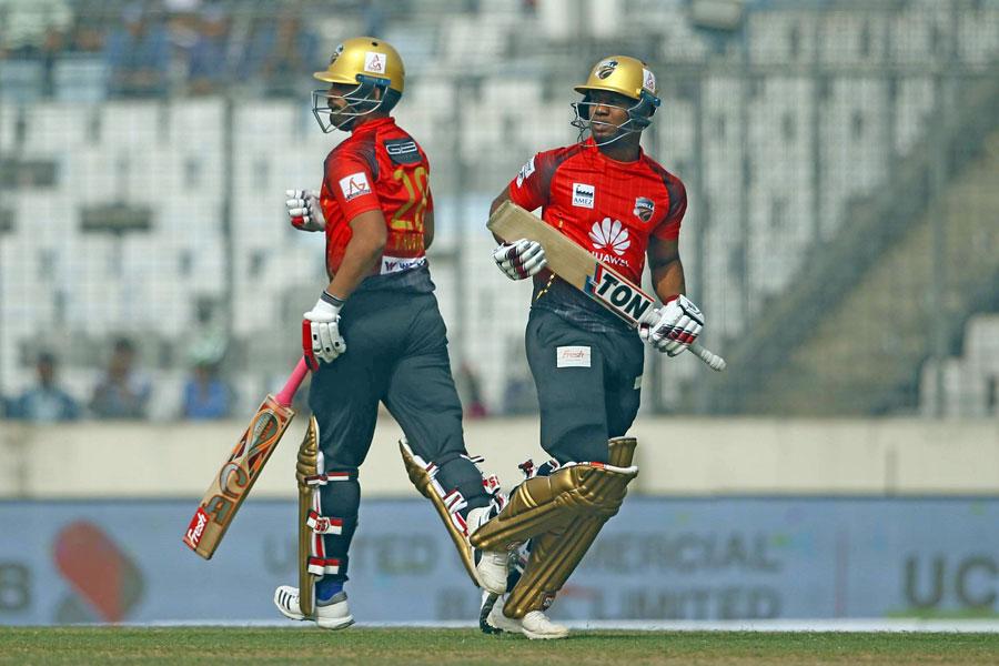 লক্ষ্য তাড়ায় এদিন শুরুটাই ভালো হয়নি ঢাকার। মেহেদী হাসানের বোলিং ঘূর্ণিতে দলীয় ২৯ রানেই শীর্ষ চার উইকেট হারিয়ে ফেলে দলটি। তবে পঞ্চম উইকেটে সে চাপ অনেকটাই সামলে নেন দুই ক্যারিবিয়ান তারকা সুনীল নারিন ও কাইরন পোলার্ড। স্কোরবোর্ডে ৪২ রান যোগ করেন এ দুই ব্যাটসম্যান। কিন্তু এ জুটি ভাঙতেই এলোমেলো হয়ে যায় সাকিবের দল।