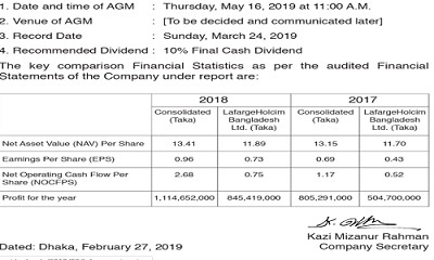 লাফার্জ হোলসিমের ১০% লভ্যাংশ ঘোষণা