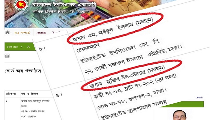 জানা যায়, ১৯৮৫ সালে ১৫ অক্টোবর প্রতিষ্ঠিত ইউনাইটেড ইন্স্যুরেন্স কোম্পানির প্রতিষ্ঠাতা চেয়ারম্যান ছিলেন এম মঈদুল ইসলাম। ২০১৪ সালের ১১ অক্টোবর তিনি মৃত্যুবরণ করেন। দীর্ঘ সাড়ে ৪ বছর আগে মৃত্যুবরণ করলেও ইন্স্যুরেন্স একাডেমির বোর্ড অব গভর্নরস’র সদস্য তালিকায় এখনো এম মঈদুল ইসলামের নাম রয়েছে।