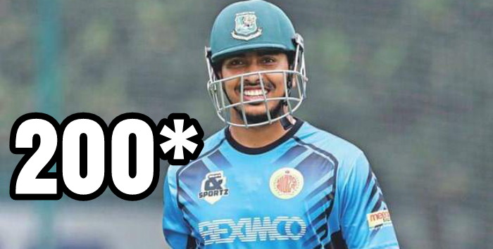 বিকেএসপির তিন নম্বর মাঠে শেখ জামাল ধানমন্ডি ক্লাবের ৩১৭ রানের বিশাল পাহাড় টপকাতে নেমে ৪৬তম ওভারের প্রথম বলে ইমতিয়াজ হোসেন তান্নাকে এক্সট্রা কাভারের ওপর দিয়ে বাউন্ডারি মেরে প্রথম বাংলাদেশি হিসেবে লিস্ট ও ক্রিকেটে ডাবল সেঞ্চুরি পূরণ করেন সৌম্য সরকার। ১৪৯ বলে ১৪টি বাউন্ডারি এবং ১৫টি ছক্কা মেরে ঐতিহাসিক এই মাইলফলকে পৌঁছান বাংলাদেশের এই ড্যাশিং ব্যাটসম্যান।