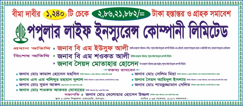 পুঁজিবাজারের তালিকাভুক্ত কোম্পানি পপুলার লাইফ ইন্স্যুরেন্স কোম্পানি চাঁদপুর ও কুমিল্লায় ২ হাজার ৯০৭ বীমা গ্রাহকের ৭ কোটি ৩১ লাখ ৬৩ হাজার ৩৫ টাকার দাবি পরিশোধ করেছে। গত ১৪ নভেম্বর চাঁদপুরে এবং ১৫ নভেম্বর কুমিল্লায় গ্রাহকদের কাছে চেক হস্তান্তর করা হয়েছে। একই দিনে গ্রাহক সমাবেশও করছে কোম্পানিটি।