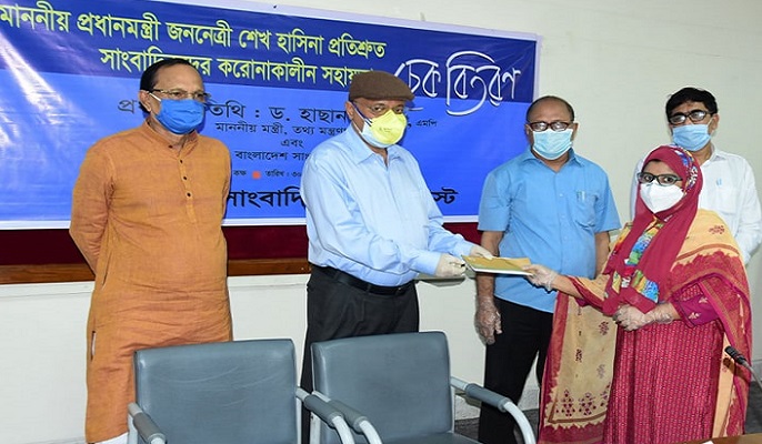 প্রধানমন্ত্রী প্রতিশ্রুত সাংবাদিকদের করোনাকালীন সহায়তা চেক বিতরণ করছেন তথ্যমন্ত্রী ও আওয়ামী লীগের যুগ্ম সাধারণ সম্পাদক ড. হাছান মাহমুদ।