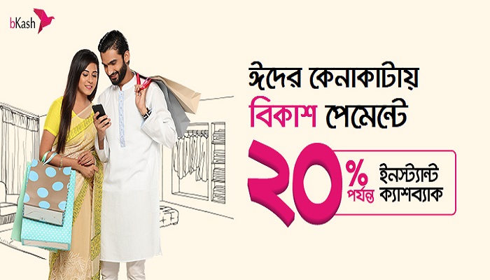 ঈদ-উল-আজহা উপলক্ষ্যে কেনাকাটার পেমেন্টে ২০ শতাংশ পর্যন্ত ক্যাশব্যাক অফার দিচ্ছে বিকাশ। ১৬ জুলাই থেকে শুরু হওয়া এই অফারটি চলবে ২ আগস্ট ২০২০ পর্যন্ত। অফার চলাকালীন একজন গ্রাহক সর্বোচ্চ ৩০০ টাকা পর্যন্ত ক্যাশব্যাক পেতে পারেন।