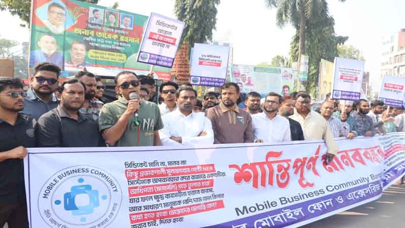 খুলনায় মোবাইল হ্যান্ডসেট বিক্রি বন্ধ রেখে ব্যবসায়ীদের মানববন্ধন -