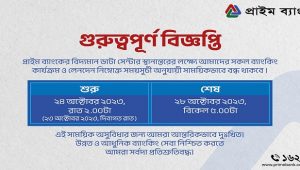প্রাইম ব্যাংকের ব্যাংকিং কার্যক্রম ও লেনদেন বন্ধ থাকবে ৫ দিন