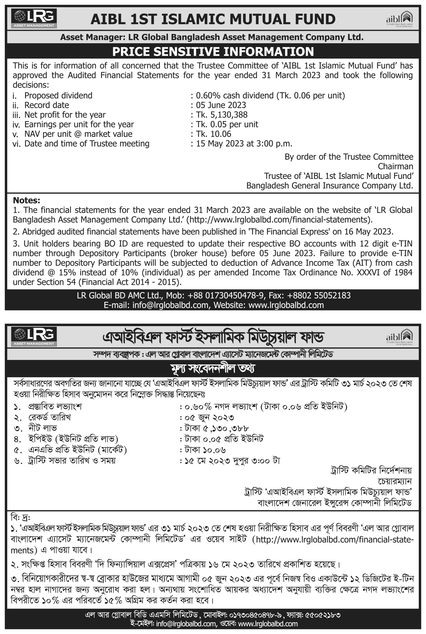 AIBL 1st Mutual Fund Price Sensitive Information