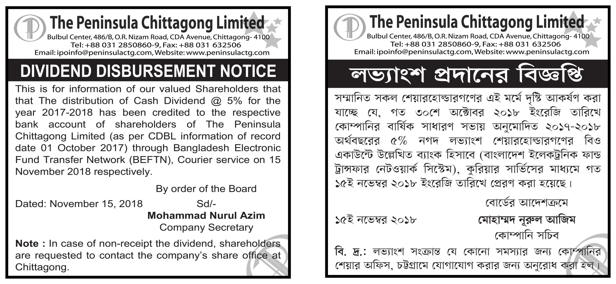 Dividend Disbursment Notice of The Peninsula Chittagong Limited