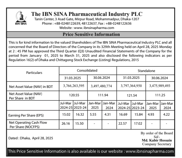 IBN SINA Pharmaceutical Industry PLC Price Sensitive Information