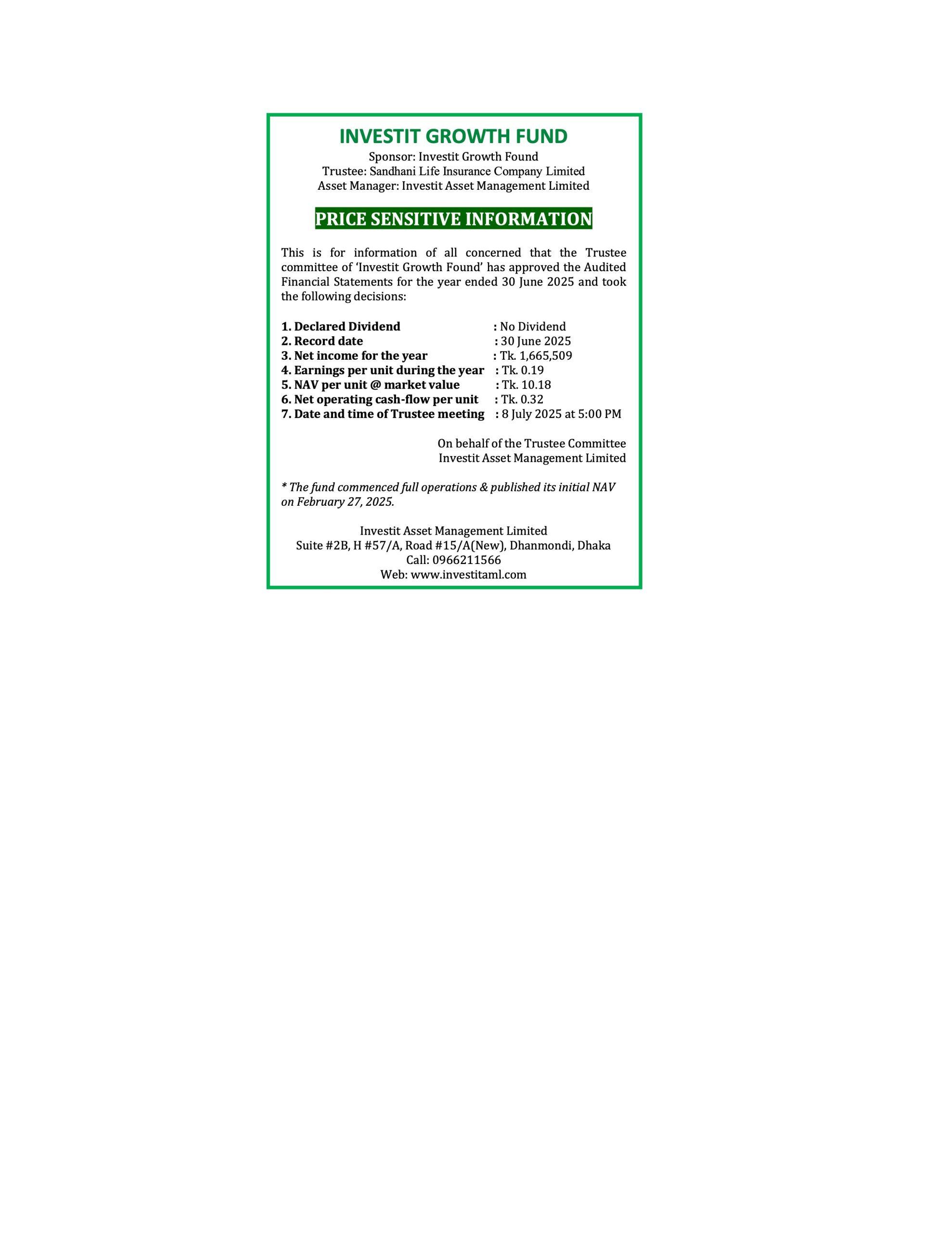 Investit Growth Fund Price Sensitive Information