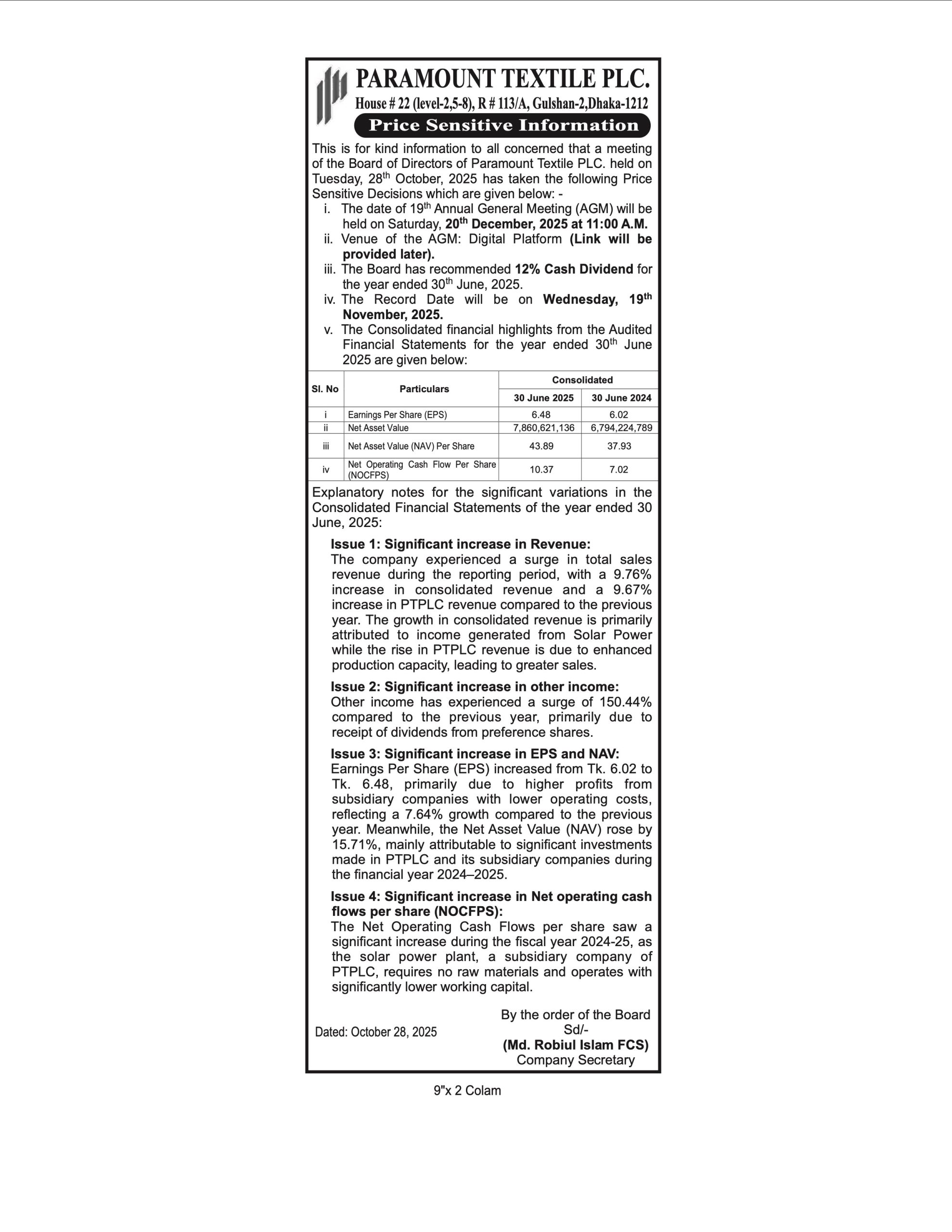 Paramount textile Ltd Price Sensitive Information