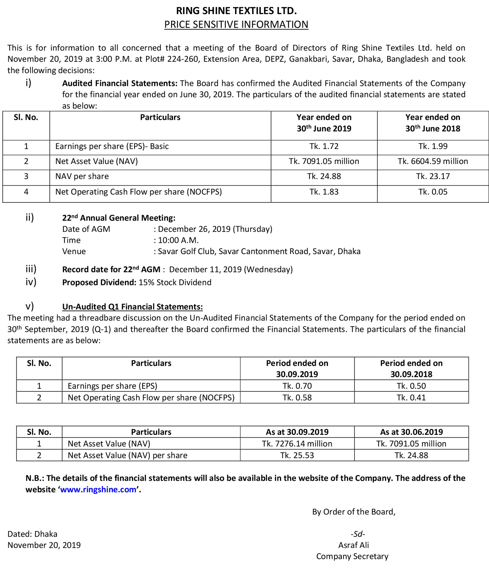 Ring Shine Textiles Ltd. Price Sensitive Information