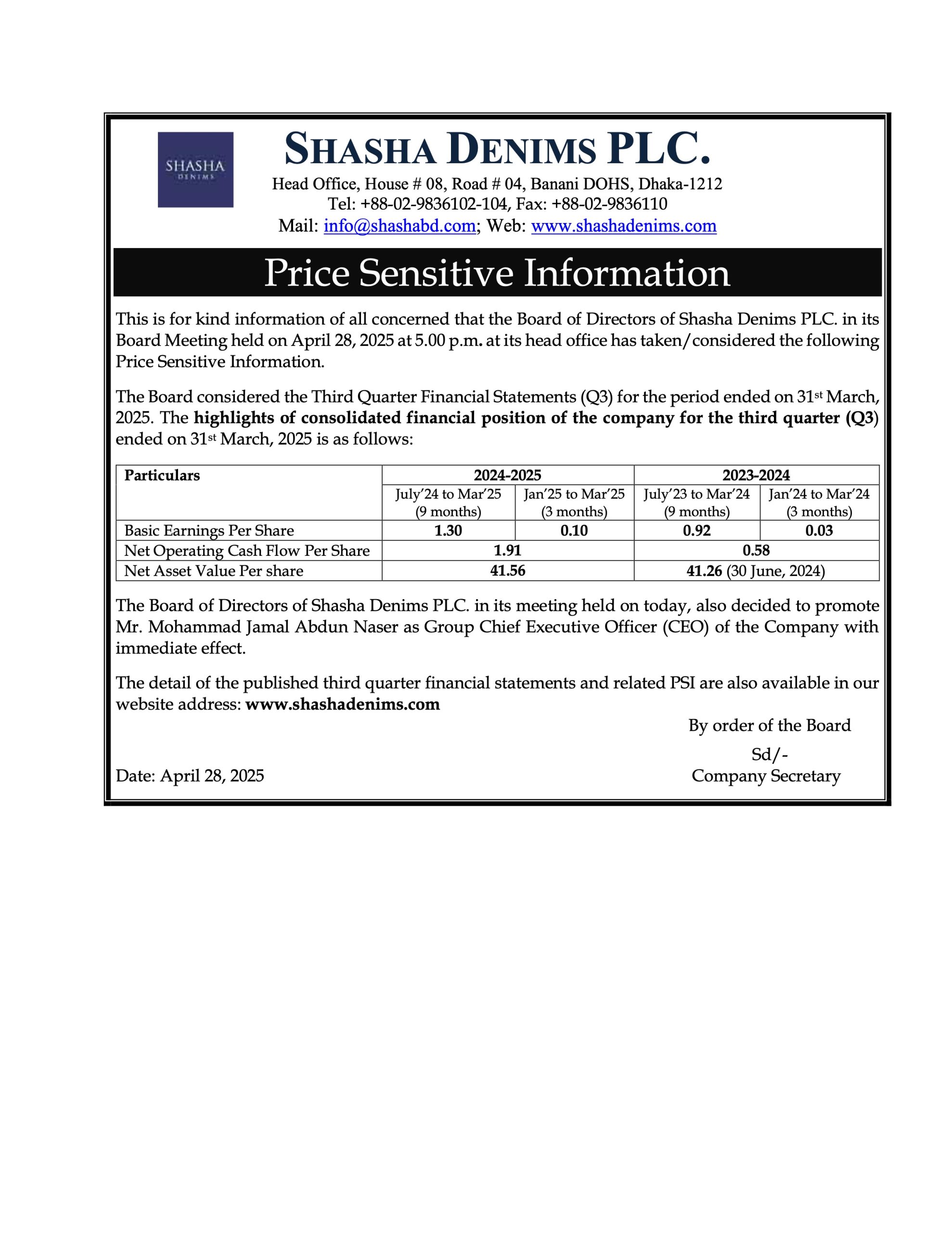 Shasha Denims Ltd. Price Sensitive Information