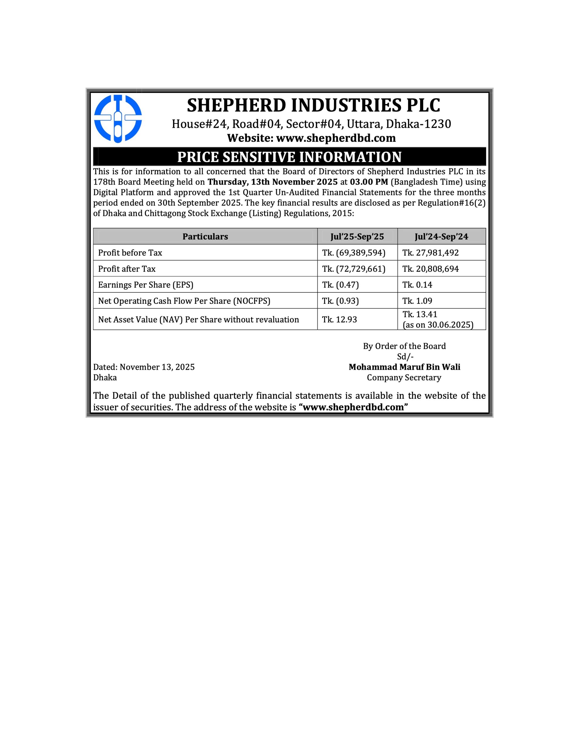 SHEPHERD INDUSTRIES PLC Price Sensitive Information