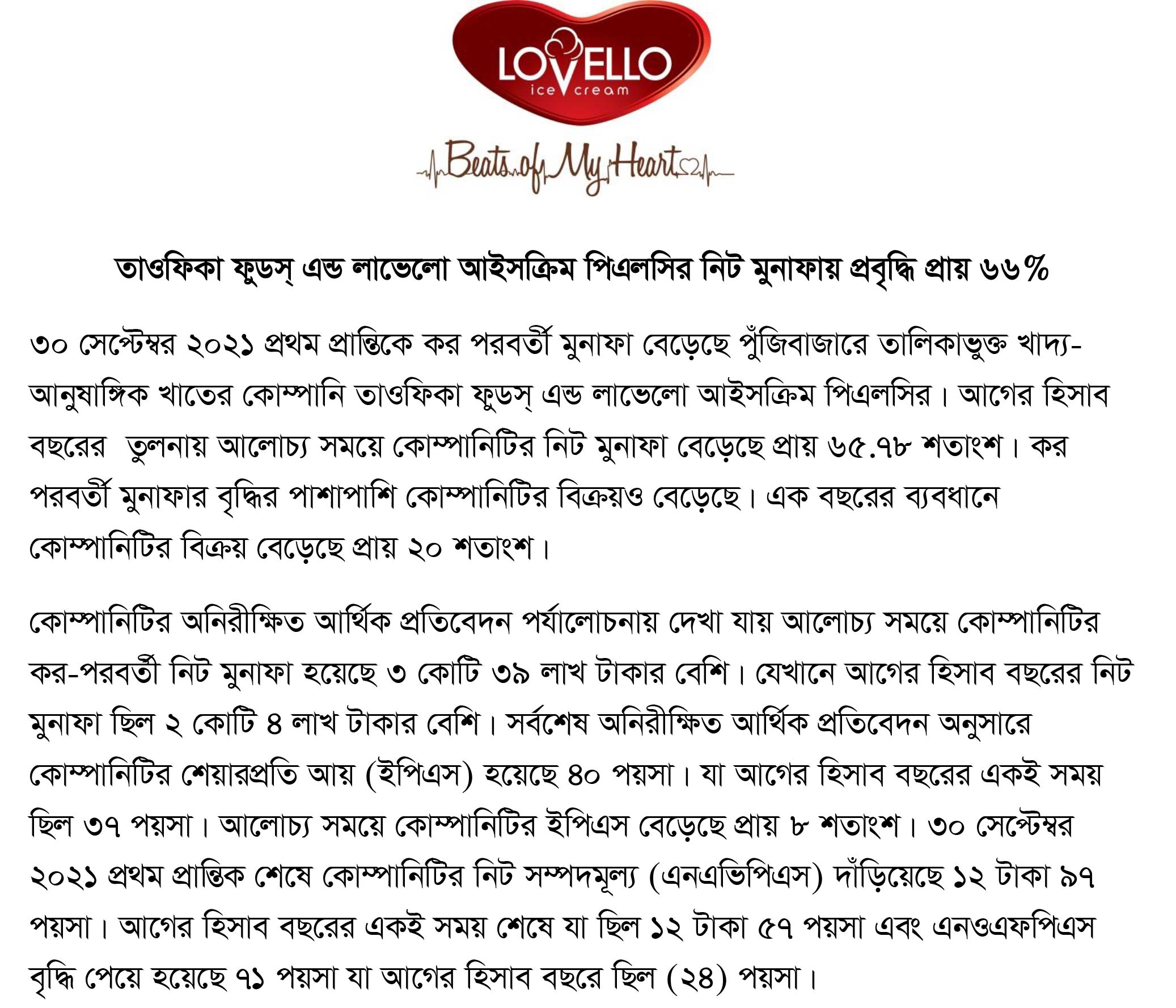 Taufika Foods and Lovello Icecream PLC Price Sensitive Information