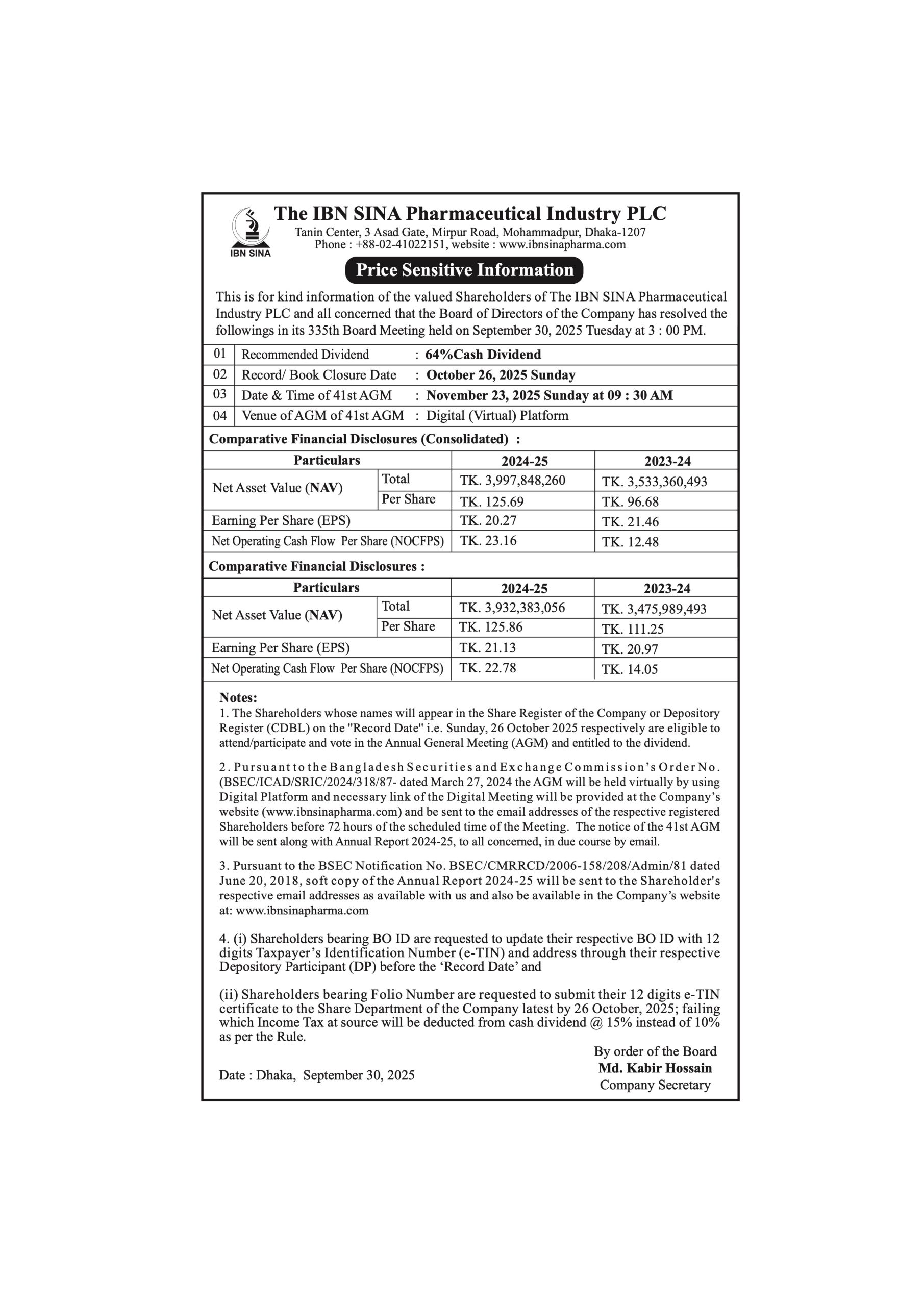THE IBN SINA PHARMACEUTICAL INDUSTRY PLC. Price Sensitive Information